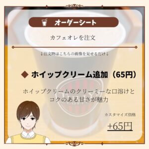- いいえ、元々ホイップはトッピングされていないので、追加したい人は+65円で追加する必要があります。