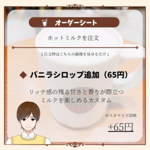 ホットミルクはそのまま飲んでも美味しいドリンクですが、カスタムしてより美味しくできるドリンクになります!