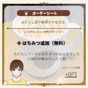 レジで「みたらし団子抹茶ラテをください」と伝え、HOTかICEかを伝えれば注文可能です。