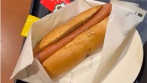 ジューシなーソーセージがサンドされていて、ケチャップとマスタードの王道ホットドッグになります。