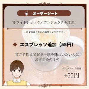 レジで「ホワイトショコラオランジュラテをください」と伝え、HOTかICEかを伝えれば注文可能です。